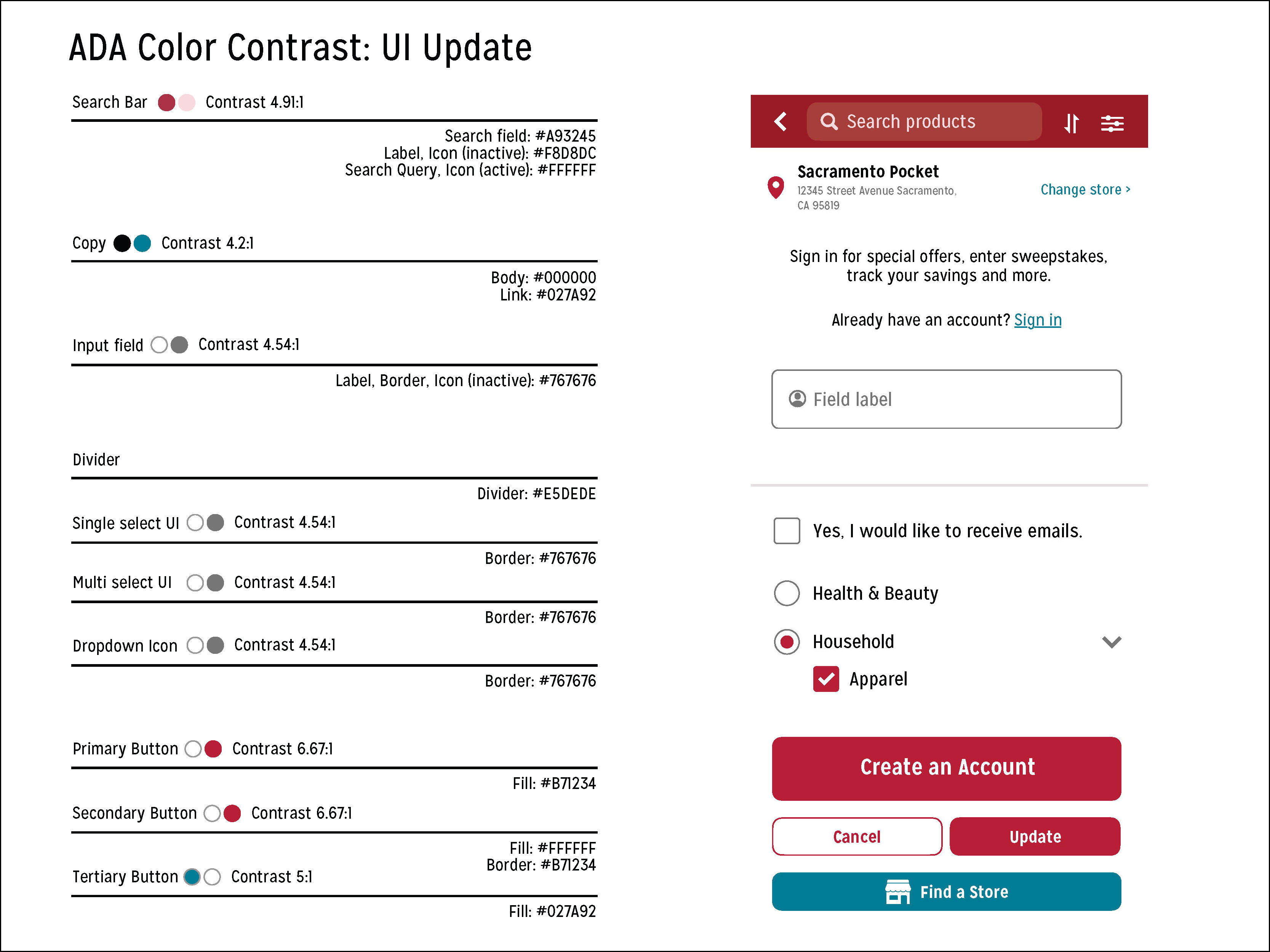 I helped modernize Grocery Outlet’s digital experience by improving accessibility, search functionality, and design consistency across the app and website.By documenting ADA best practices, refining UI prototypes, and redesigning key pages using brand refresh principles, we built a more cohesive, user-friendly experience that boosted engagement and set a new internal standard for digital design quality.