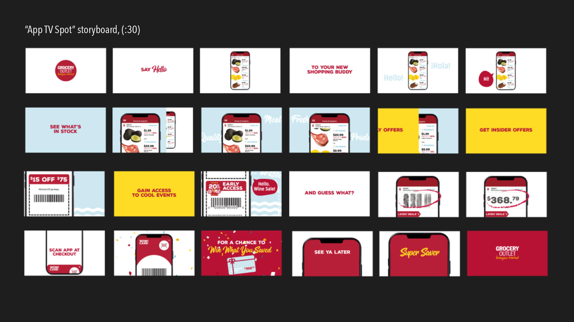 I led the direction and production of a TV ad launching Grocery Outlet’s mobile app, working with a small budget and a tight turnaround. The goal was to communicate the app’s benefits and features clearly while staying true to the brand’s playful tone.